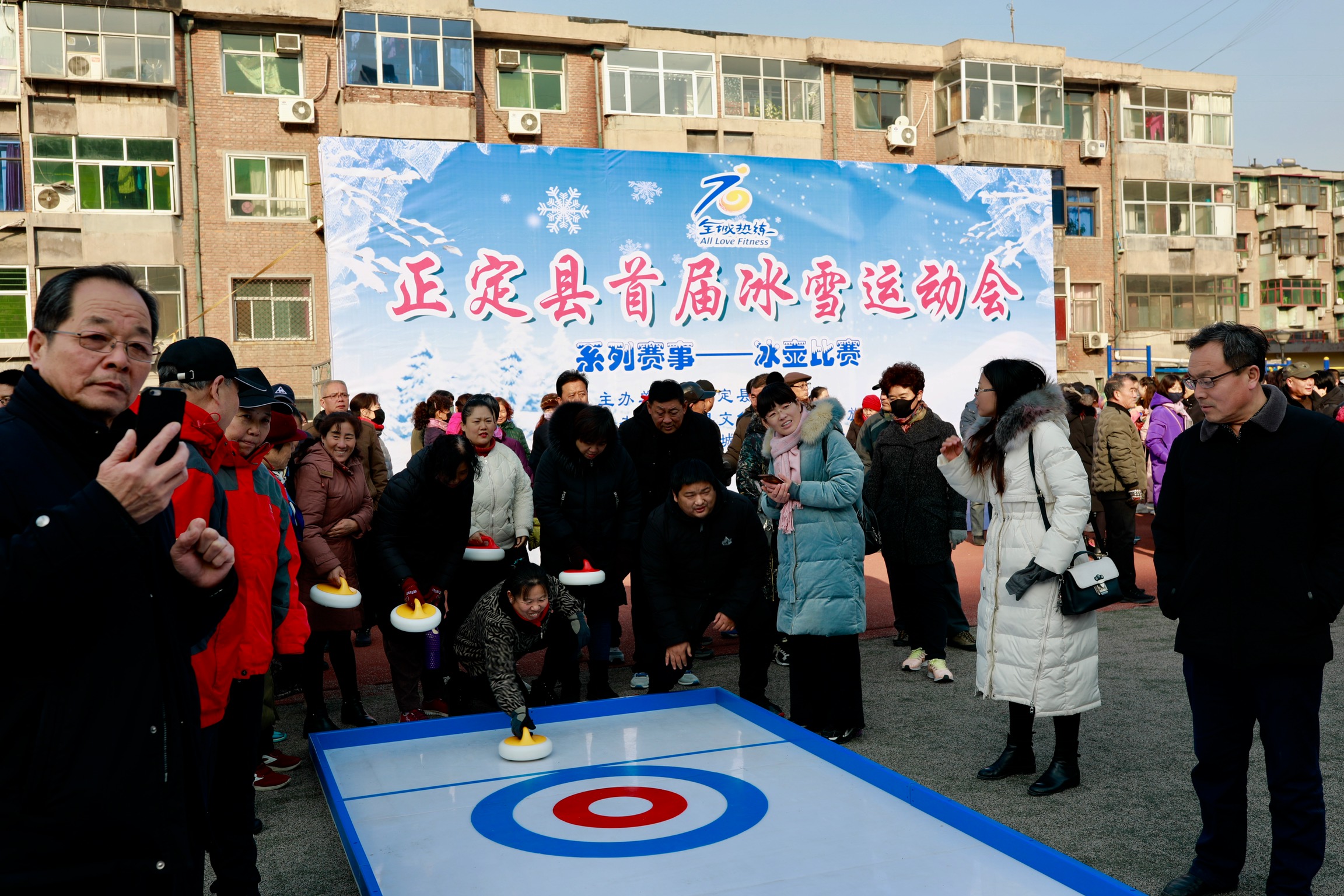正定县首届冰雪运动会冰壶进社区比赛,12月19日,在正定晶都体育场举行。