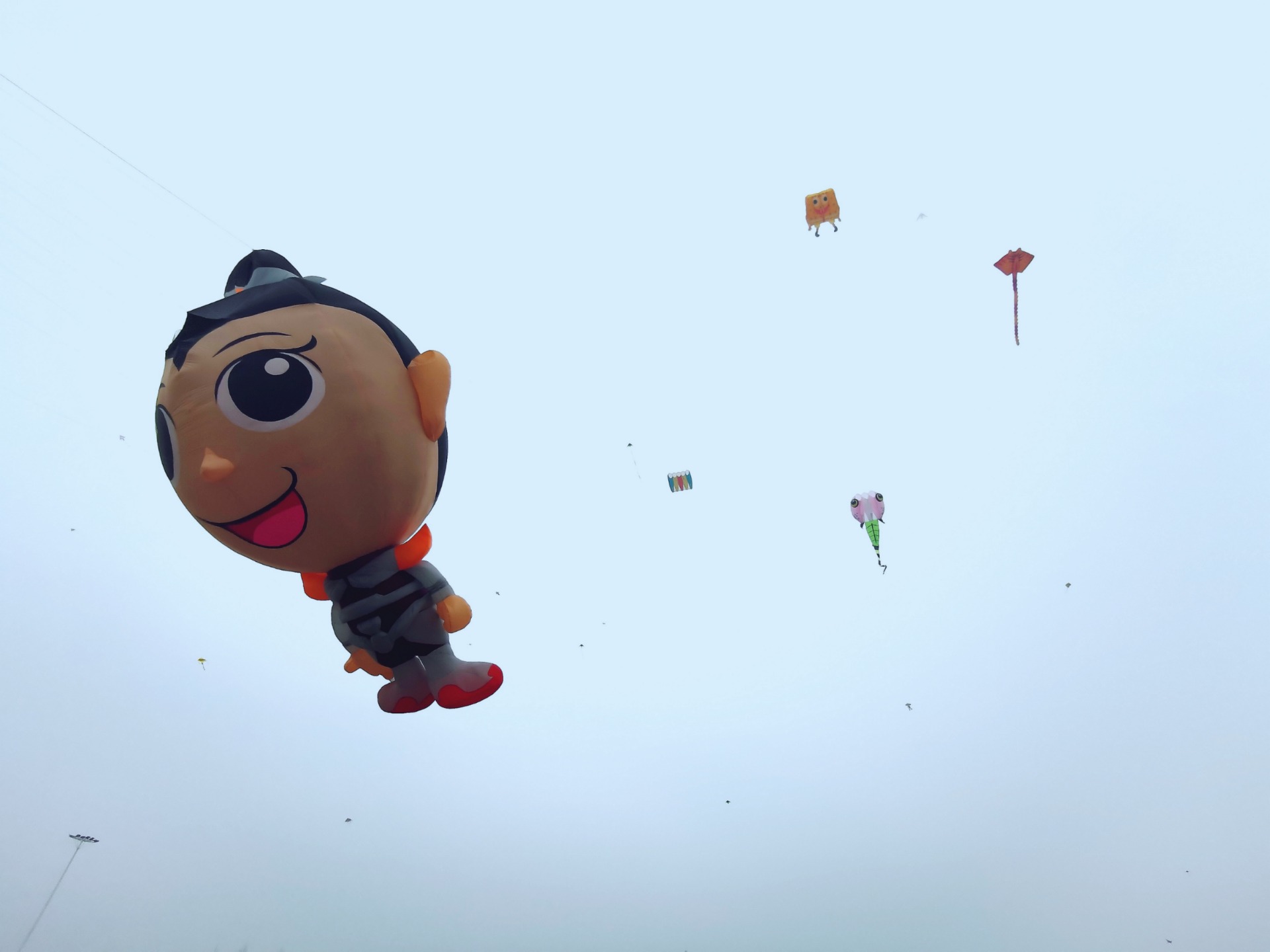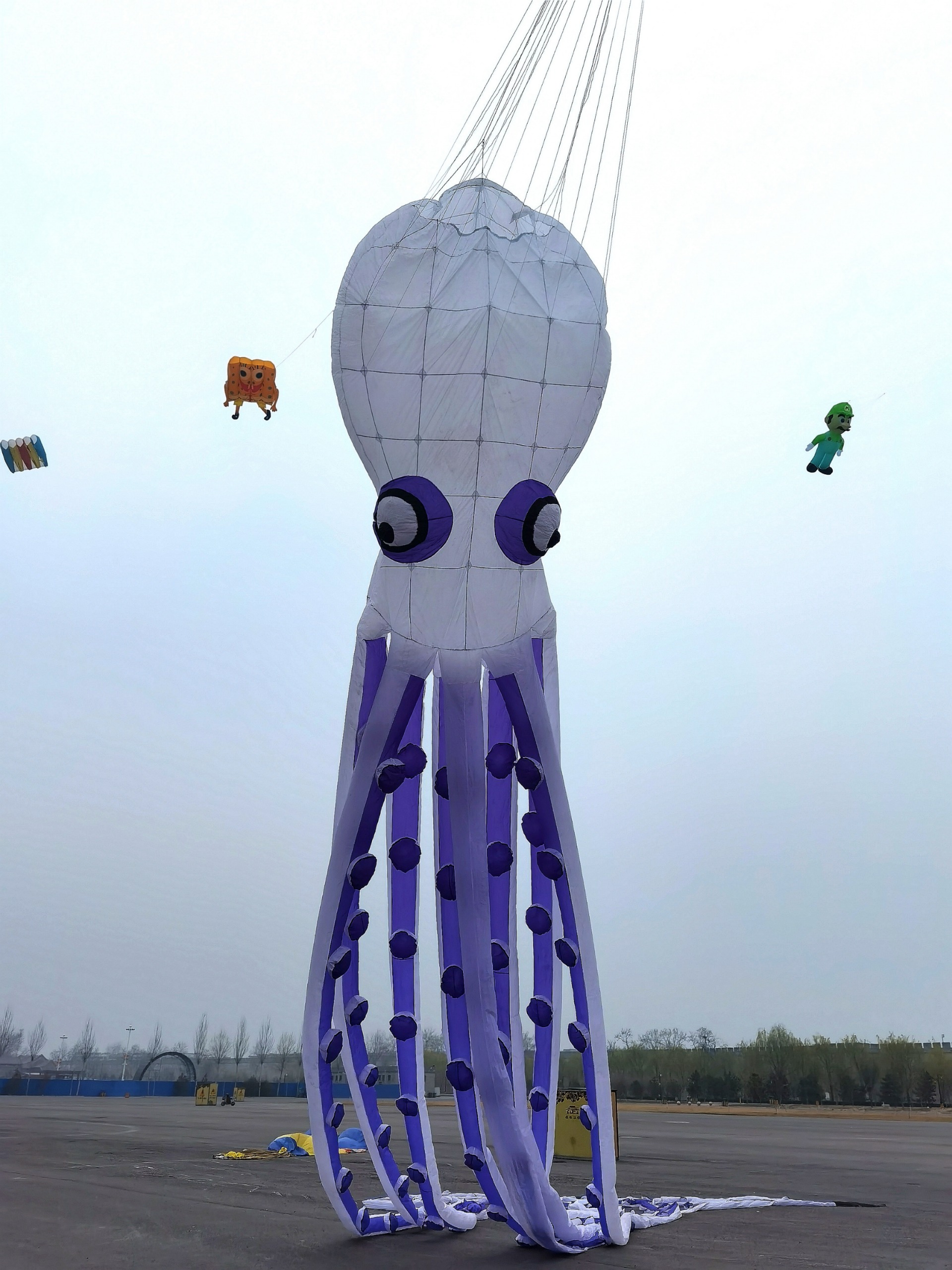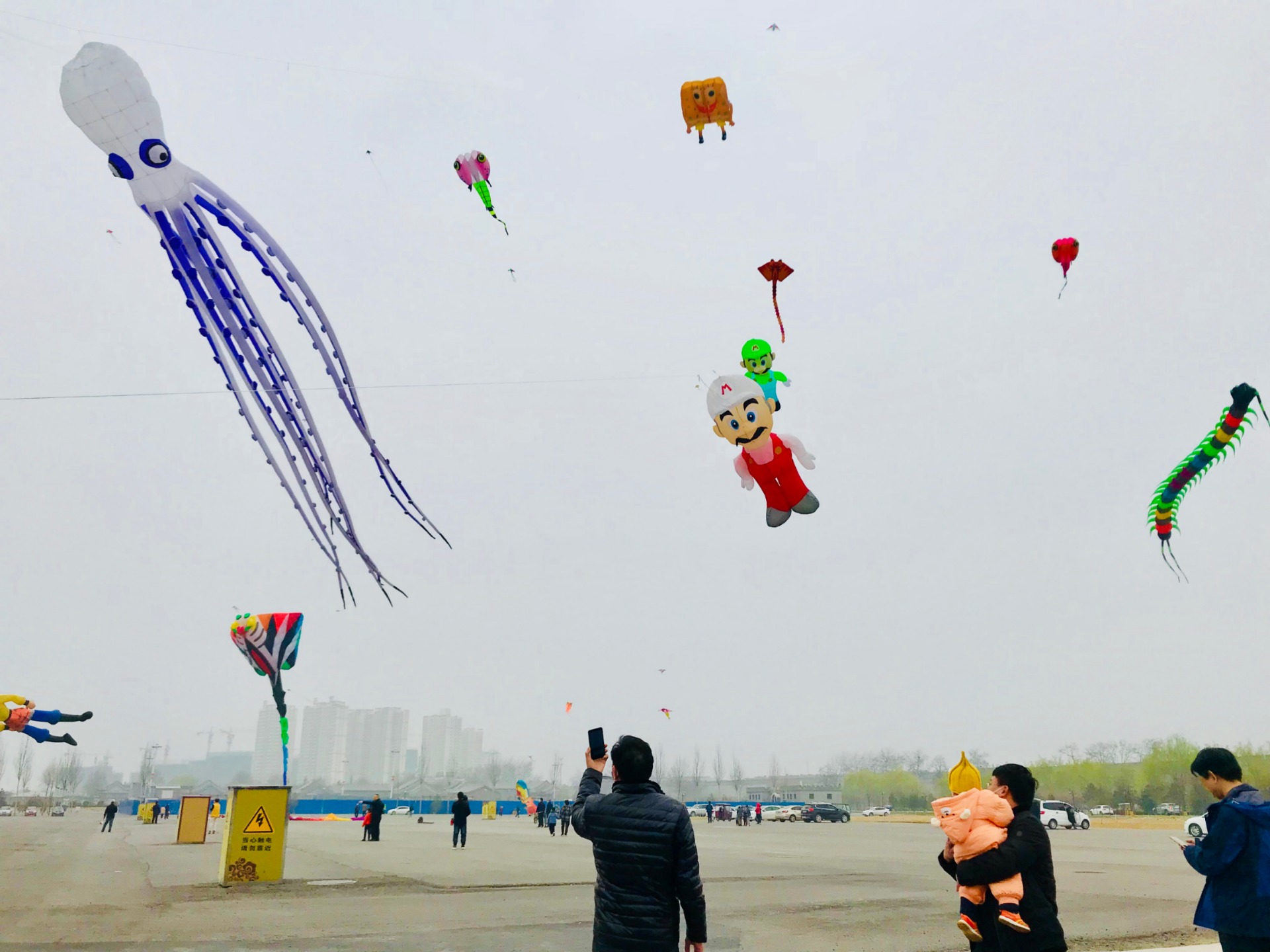卡通人物的三国赵云,六七十米的龙,形象夸张的乌贼,憨态可掬的海绵宝宝等各式各样的形状的风筝在空中飞舞。