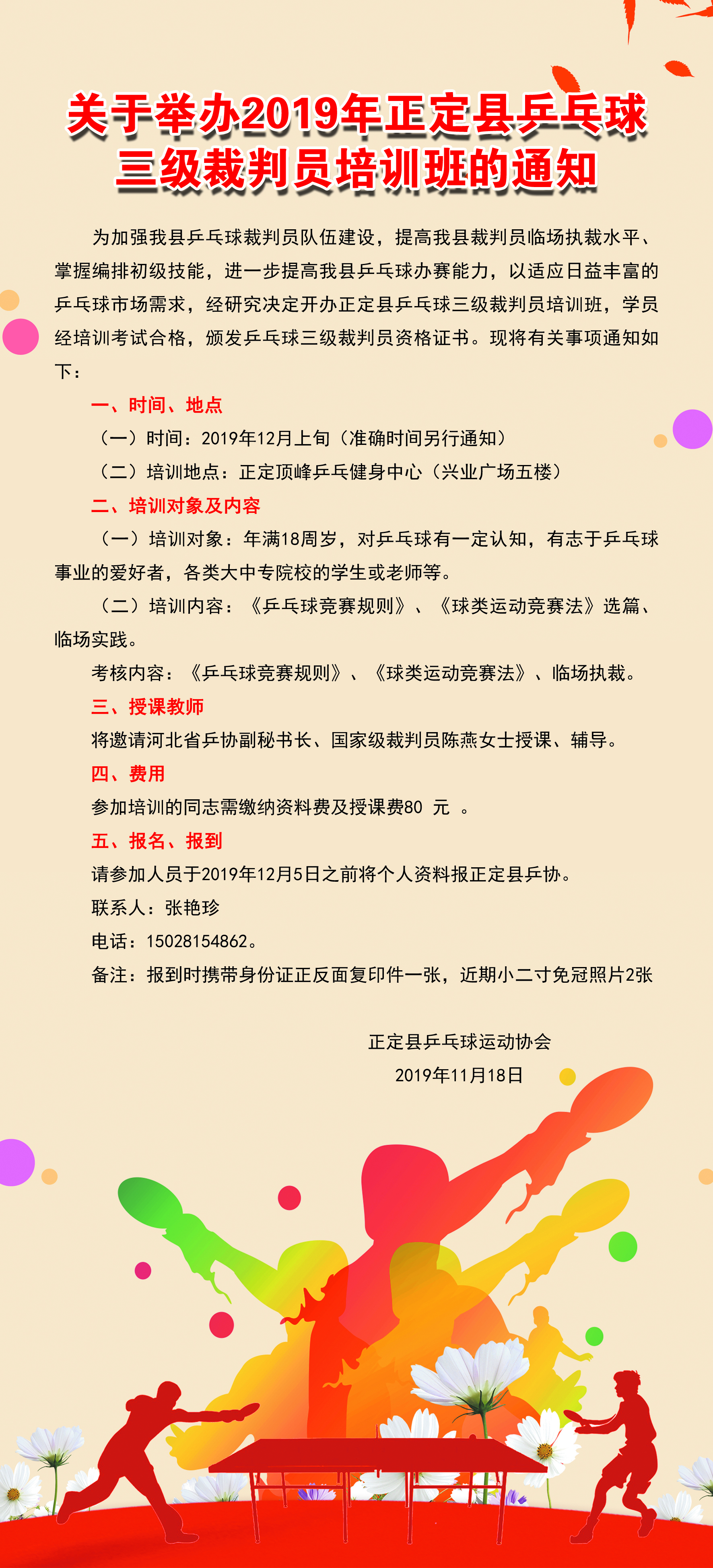 为提升正定县业余乒乓球队伍整体水平,正定县乒乓球协会将举办裁判员培训班。