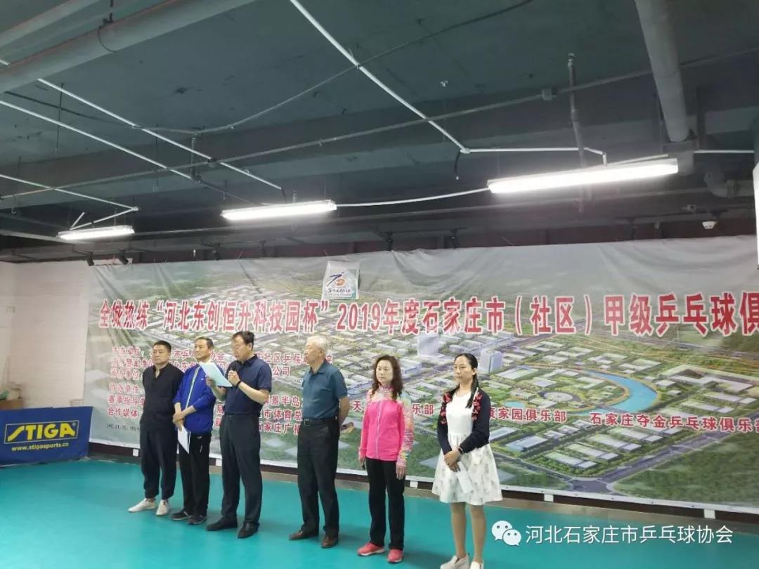 5月19日上午8点30分首站2019年度甲级俱乐部联赛在石家庄来搏俱乐部火热开赛,出席开幕式的有:石家庄市乒协副秘书长王锡堃先生、东创恒升科技园营销总监窦玉刚先生、石家庄社区学院常务院长聂亚峰先生、石家庄来搏俱乐部总经理王建新先生、石家庄市乒乓球协会副秘书长、本次比赛裁判长刘素彬女士、开幕式由田丽霞女士主持。
